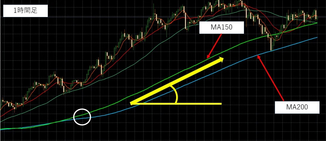 上記の例でいえば、MA150とMA200がクロスし間隔が空く白丸あたりから「ロング」狙いとなります。(ショート狙いは逆)